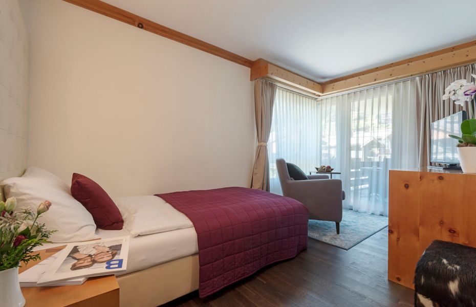 Dieses komfortable Einzelzimmer bietet ein französisches Bett, einen Schreibtisch sowie Sessel. Das schöne Arvenholz sorgt für Gemütlichkeit. Modernes Bad mit Dusch-Badewannen Kombination. Der Nordbalkon mit Sicht zur Mischabel-Bergkette lässt Sie die Morgensonne in voller Pracht geniessen!