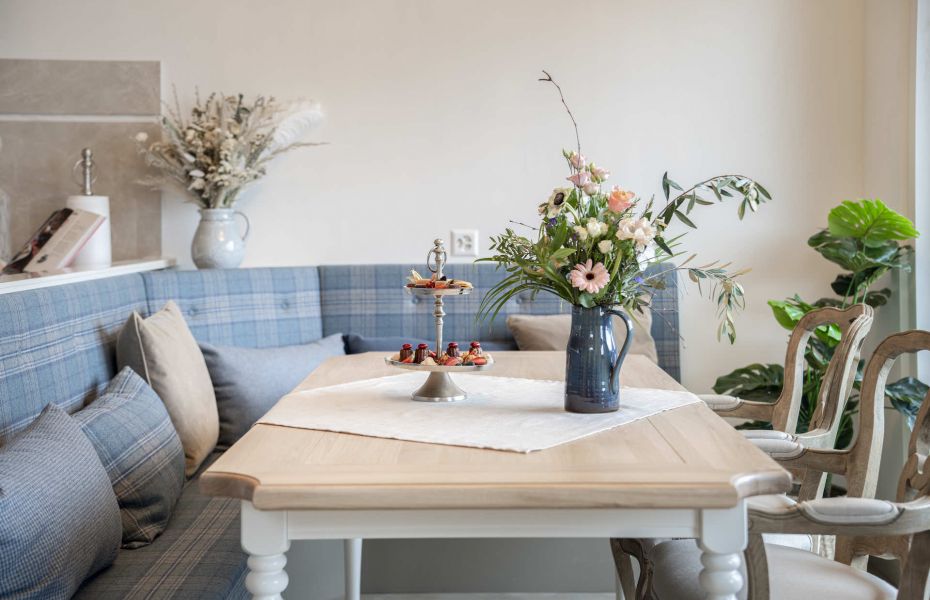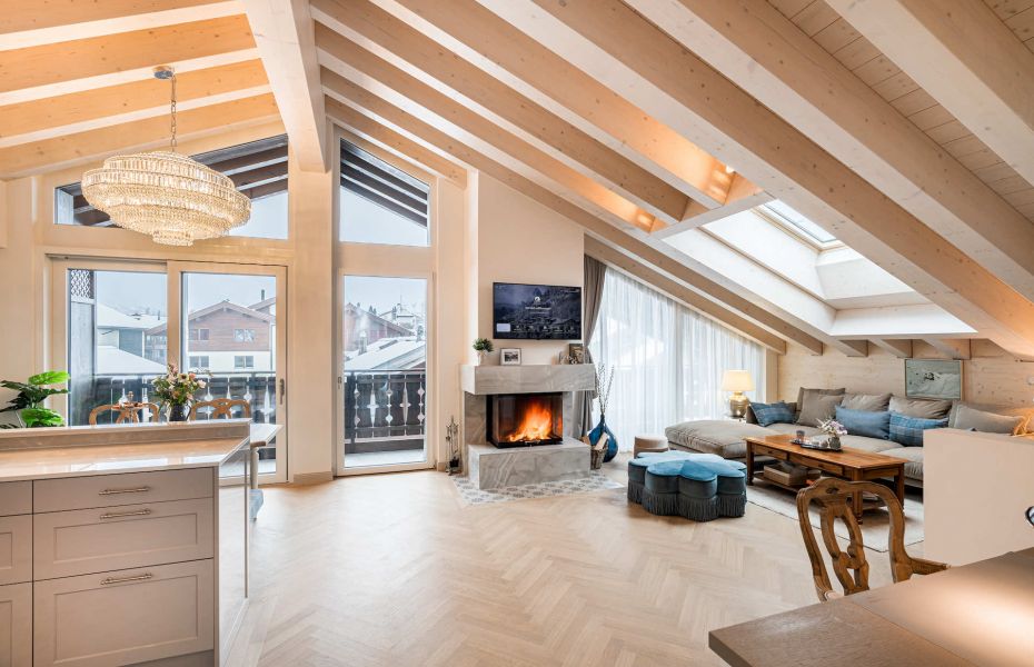 Splendid living area with romantic woodburning fireplace, open plan kitchen and dining table for up to 8 people