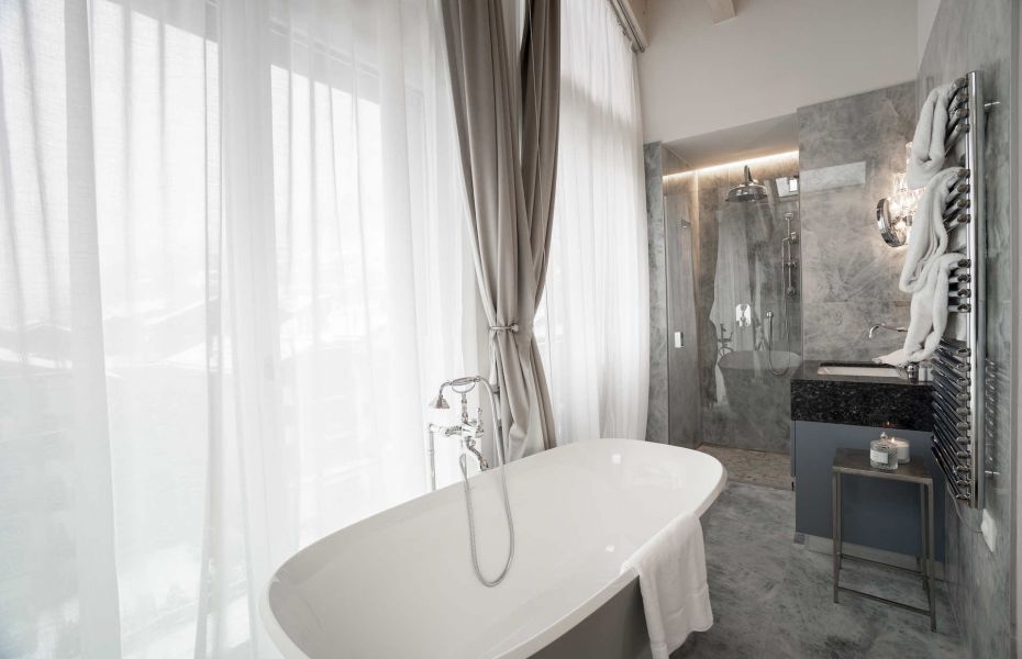 Master bedroom on the fourth floor with window front facing the Mischabel mountain range, a cosy double bed (super King size) or two twin beds, open bathroom with freestanding bathtub and rain shower, and separate shower-toilet (bidet)