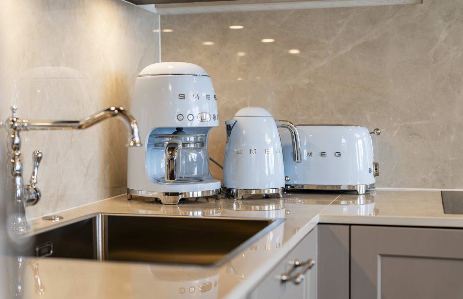 Fully equipped kitchen with induction hob, oven, microwave, Lavazza espresso machine, toaster, fondue set and much more…